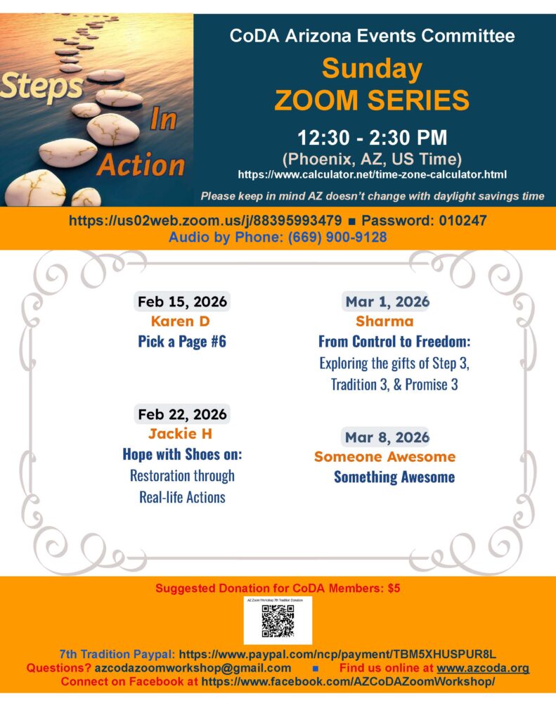 Welcome! Here you’ll find upcoming Arizona Co-Dependents Anonymous (CoDA) workshops, meetings, and events — both online and in person.